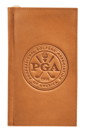 The Vertical Scorecard Holder is made of genuine leather with a back pocket, inside pen loop and polished brass clip